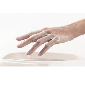 Remplir le bol jusqu'à la ligne 'Max' puis immerger la main. L'ergonomie de l'appareil permet d'y placer la main de manière confortable afin de se relaxer pendant le soin.