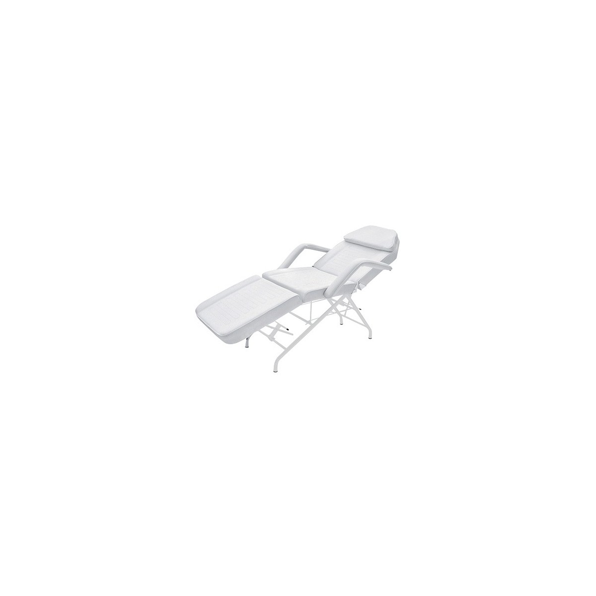 Fauteuil à 3 plans et structure métallique. Réglage indépendant de l’inclinaison du dossier et des jambes. Accoudoirs amovibles et repose-tête avec trou visage et coussin amovible. Revêtement en PVC blanc de haute qualité et facile à nettoyer.