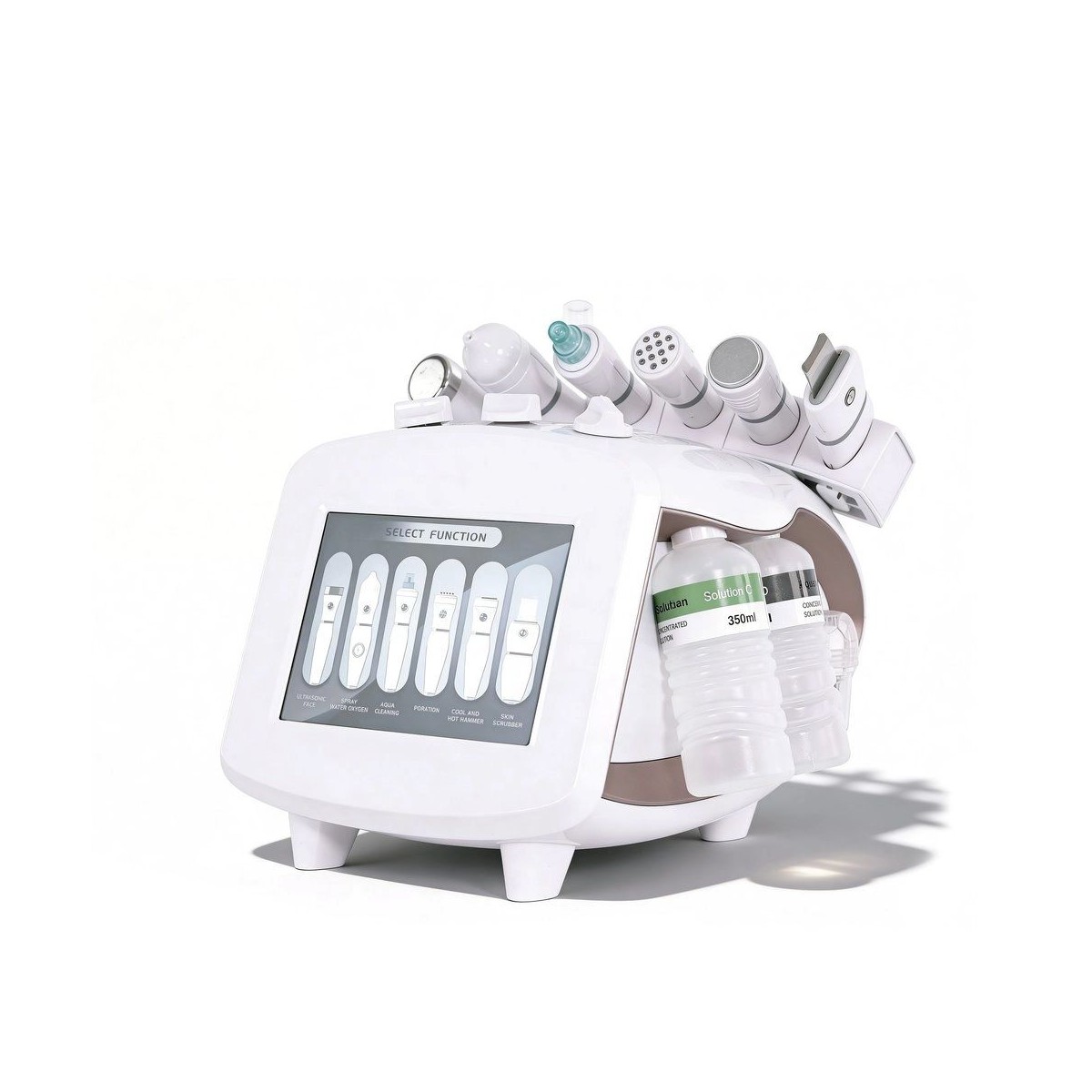 équipement digital moderne 6 en 1 avec des technologies avancées d'usage professionnel pour le soin facial, équipé de peeling ultrasonique, électroporation EP, hydro dermabrasion, ultrasons, spray d'oxygène et marteau chaud-froid.